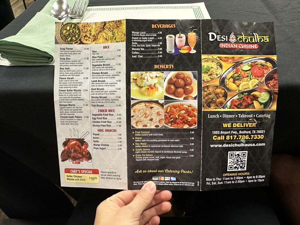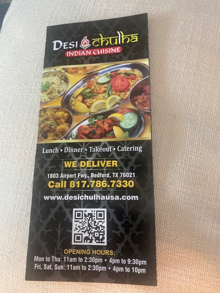 Desi Chulha Indian Cuisine, located in Bedford, TX, is a casual Indian restaurant offering delivery and takeout options with outdoor seating available. The menu boasts a variety of appetizers like Vegetable Samosa, Keema Samosa, and Chicken Samosa, along with soups like Mulligatawny Soup and Tomato Soup. Their Mixed Green Salad and Chef's Special Salad are also popular choices. Customers rave about the flavorful Paneer Pakora and Paneer Butter Masala, as well as dishes like Lamb Vindaloo and Chicken Saag. The quality of the food, generous portion sizes, and friendly staff have earned Desi Chulha high praise from patrons. If you're a fan of authentic Indian cuisine, this spot is a must-try for delicious and satisfying dishes.